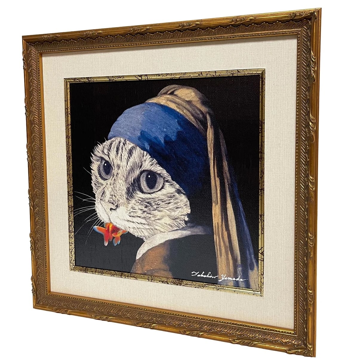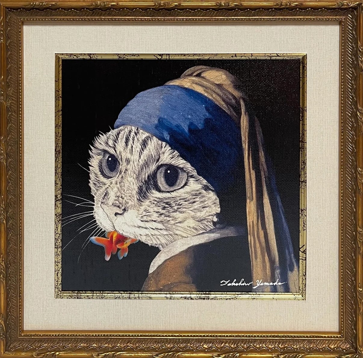 金魚を食べる夢には、 『チャンスをつかむ』 という意味があるらしい。コロナ禍の2020年、デジタルとアナログの融合を模索し生まれたフェルメール猫シリーズ2024年作品。Edition of 10。